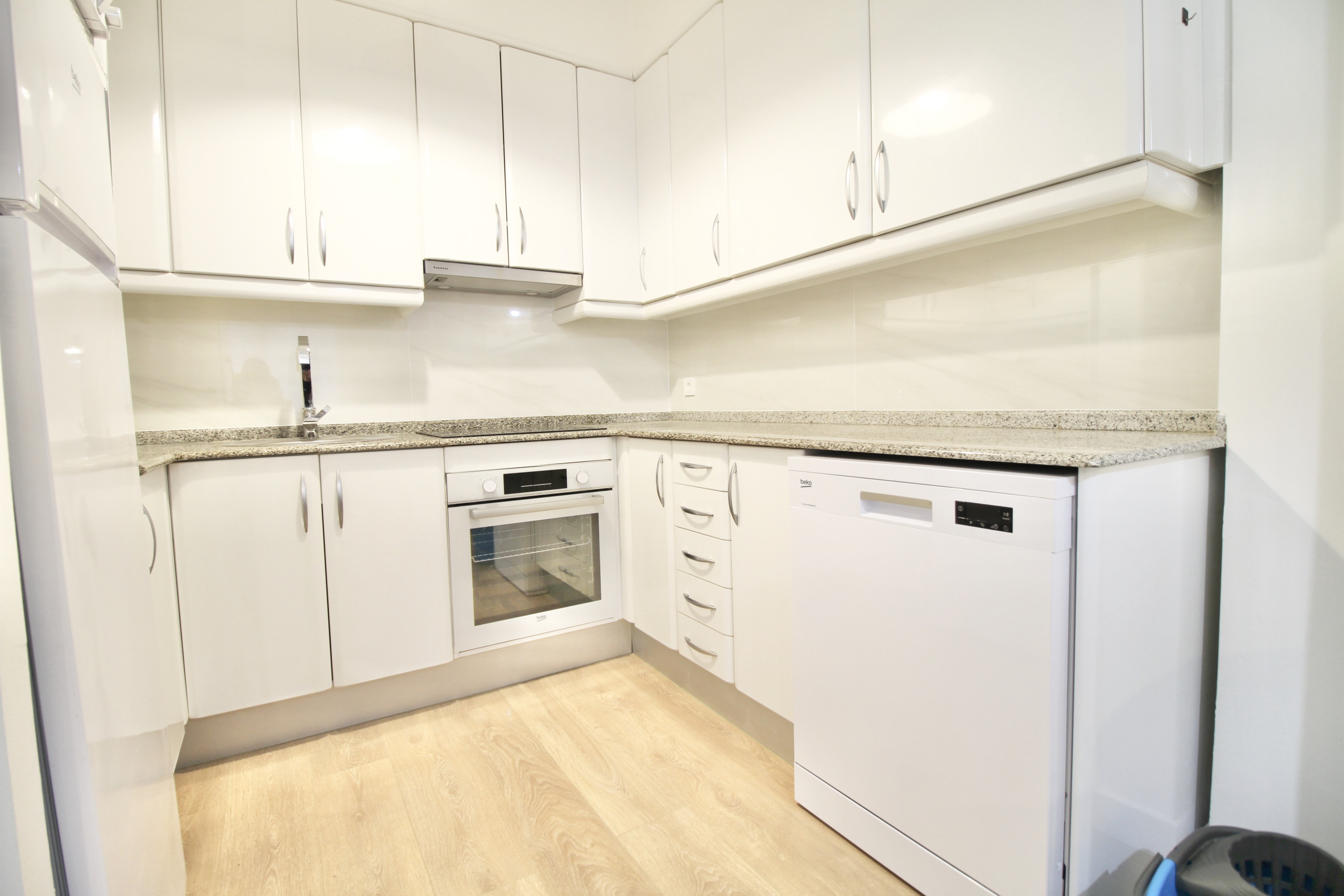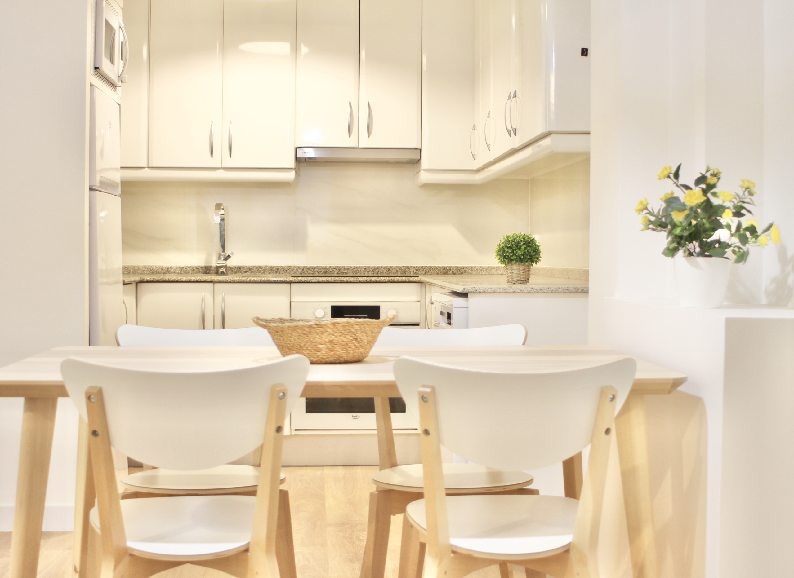 La cocina, moderna y funcional, cuenta con todo lo necesario para que puedas preparar tus platos favoritos: nevera, microondas, horno, congelador, y hasta una cafetera para empezar el día con energía. Todo lo que necesitas está a tu alcance.