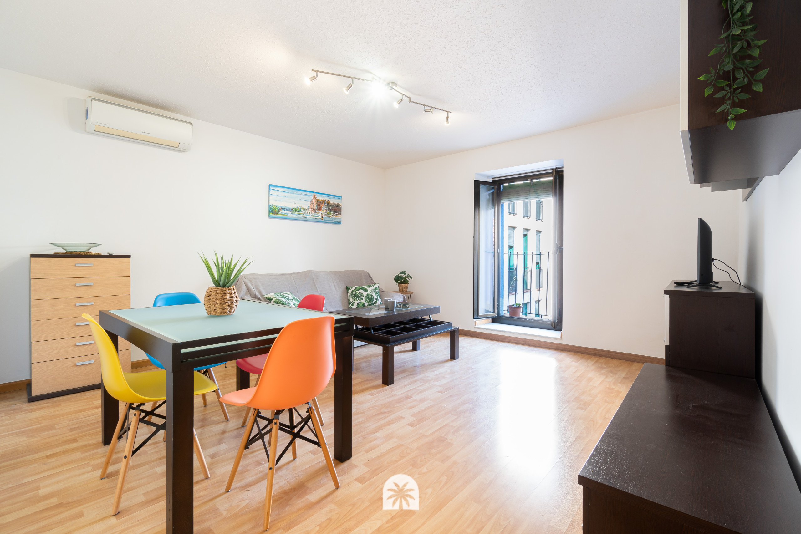 El apartamento está equipado para cubrir todas tus necesidades: cuenta con aire acondicionado en todas las habitaciones para esos días calurosos, calefacción central para los meses más frescos, y acceso a Internet (wifi) para mantenerte conectado. Además, dispone de ascensor, lo que añade un plus de comodidad, y de una lavadora, plancha y secador, para que te sientas como en casa. Relájate en la sala de estar viendo tus programas favoritos en el televisor después de un día explorando la ciudad.