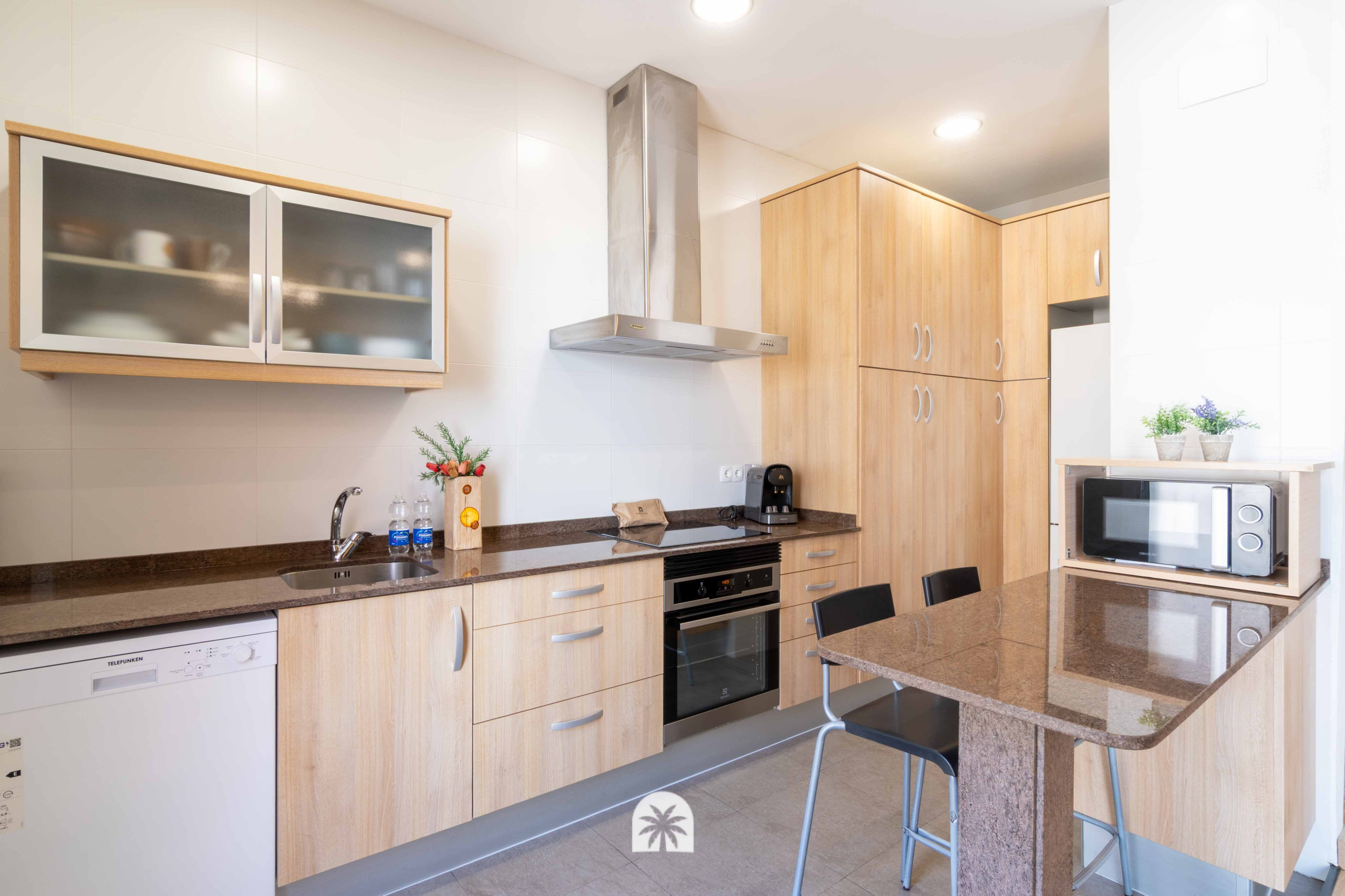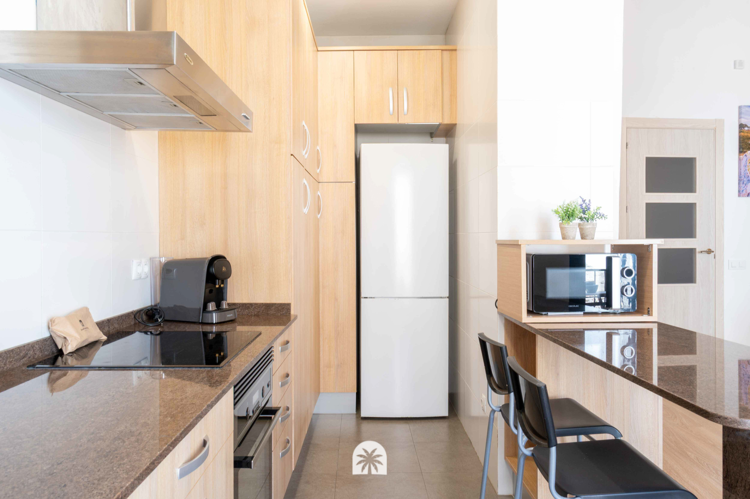 La cocina está equipada con todo lo que puedas necesitar para preparar tus platos preferidos, incluyendo nevera, microondas, horno, congelador, cafetera y tostadora, asegurando que tus comidas sean tan agradables como el resto de tu estancia.