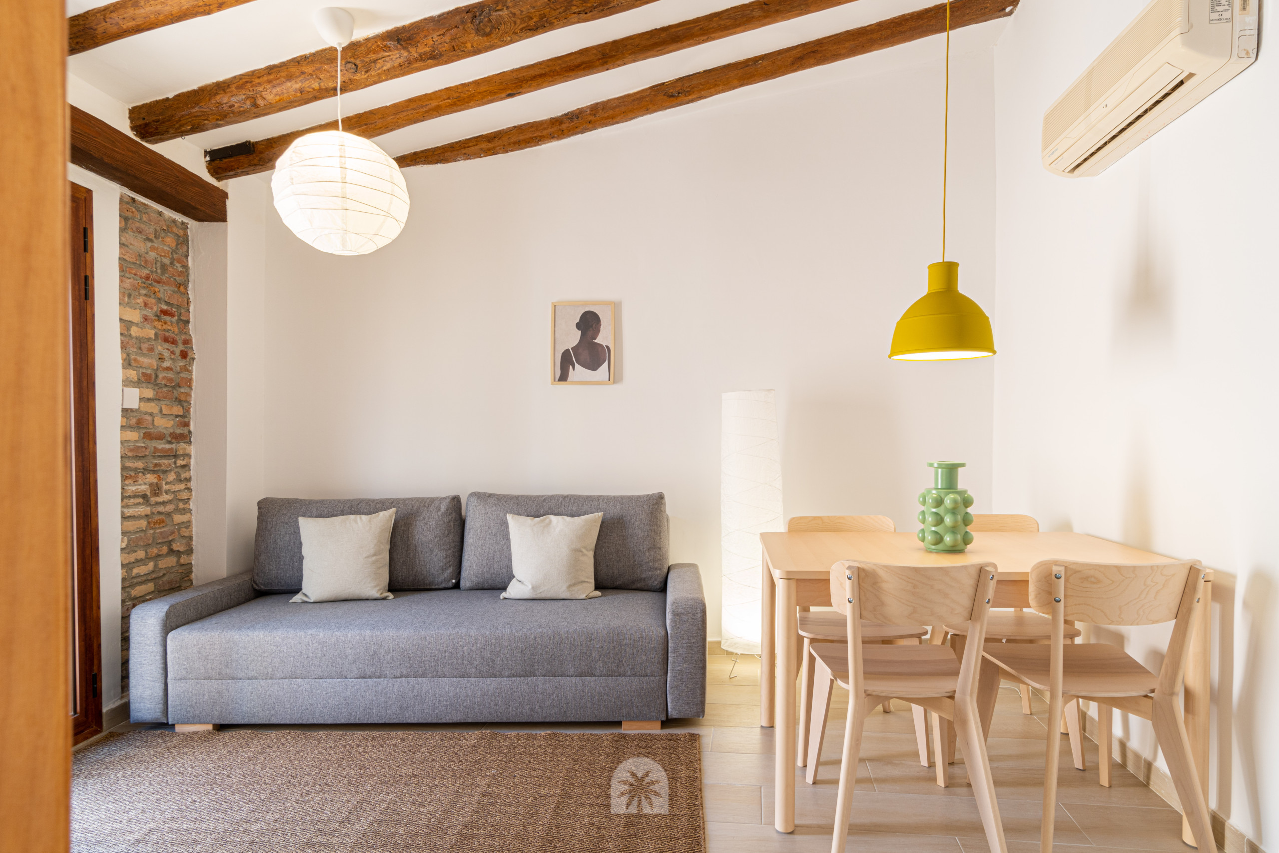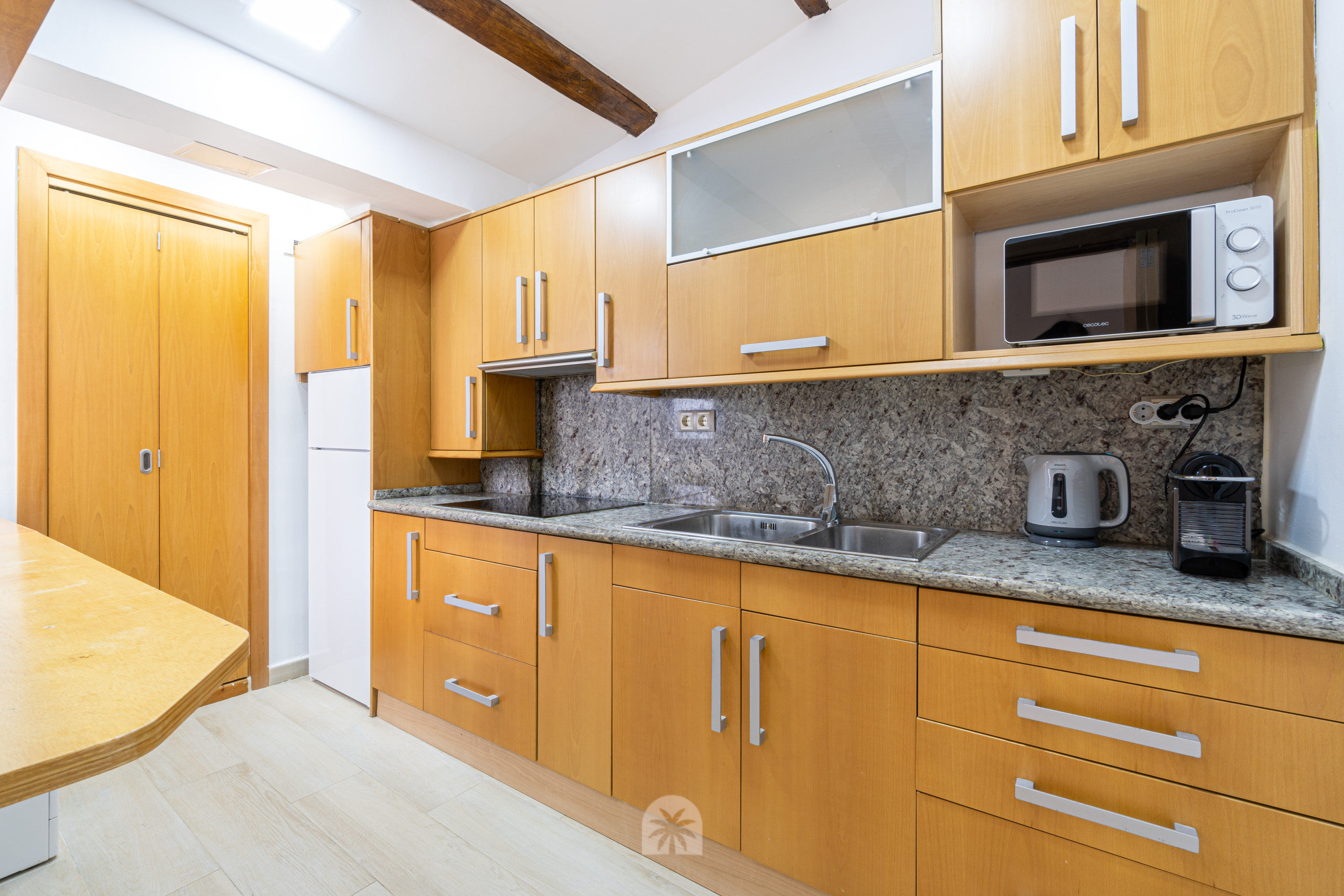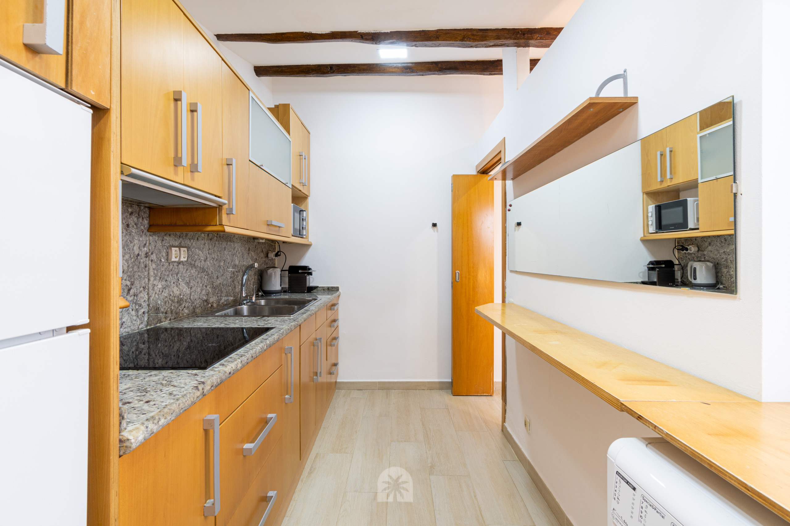 Este espacio está diseñado con un estilo moderno y acogedor, destacando el uso de maderas naturales que aportan calidez al ambiente. El apartamento cuenta con una cocina americana completamente equipada, un baño completo, un dormitorio doble, y un salón comedor moderno con un sofá cama doble, ideal para parejas o pequeños grupos.